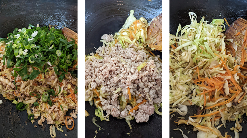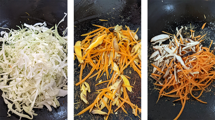 מוסיפים כף שמן לווק ואת הגזר והפטריות, מטגנים דקה ומוציאים לצלחת. מוסיפים כף שמן נוספת ואת הכרוב ומטגנים כדקה עד שהכרוב מתרכך מעט.