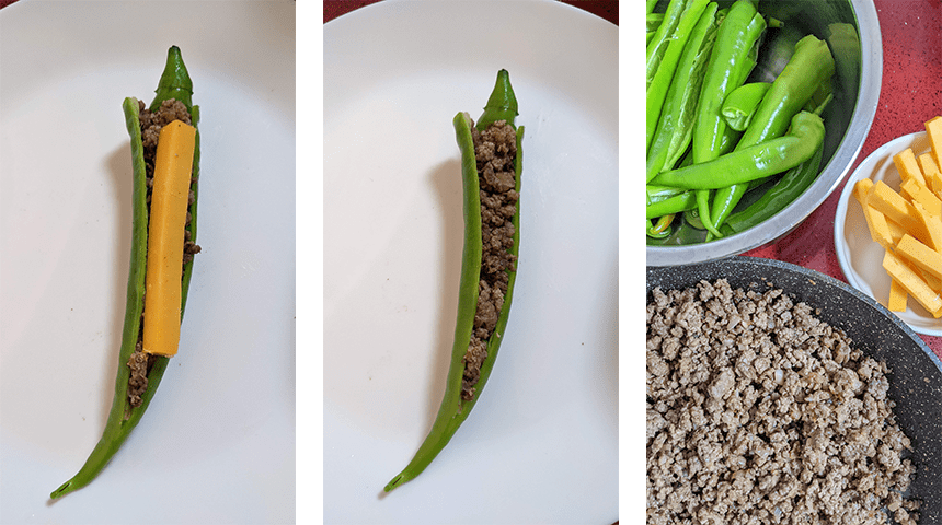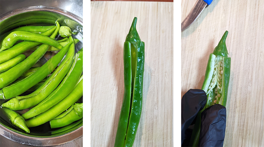 מכינים אל הצ'ילי למילוי – חורצים את הצ'ילי לרוחבו בחלקו העליון קרוב לעוקץ ולאורכו כמעט עד לקצה. בעזרת כפית או סכין קטנה נפטרים מהגרעינים ומהחלקים הלבנים שבתוך הפלפל. מרוקנים באותה הצורה את כל הפלפלים, שוטפים היטב ומניחים בקערה מלאה מים לפחות לרבע שעה על מנת למתן את החריפות.