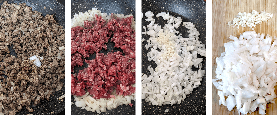 מכינים את המלית – קוצצים דק שום ובצל. מחממים שתי כפות שמן במחבת, מוסיפים את השום והבצל ומטגנים מעט. מוסיפים את הבשר ומטגנים עד שהוא משנה את צבעו, מתבלים במלח ופלפל שחור גרוס וממשיכים לטגן עד שהנוזלים מתאדים והבשר שחום. מוציאים לצלחת ומצננים.