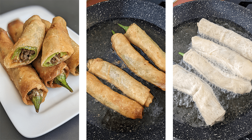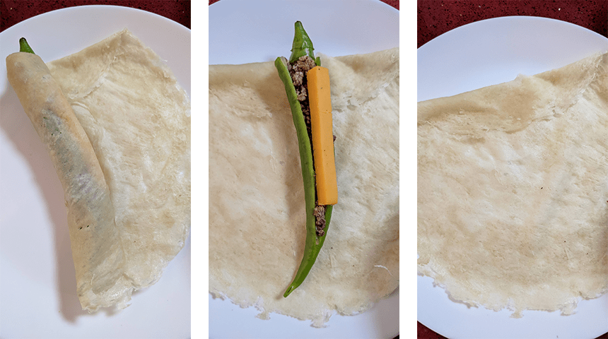 על משטח עבודה מניחים דף בצק, מקפלים מעט את חלקו העליון ומניחים צ'ילי ממולא על הקפל כאשר העוקץ מחוץ לבצק. מקפלים את הבצק על הצ'ילי ומגלגלים פעם אחת.