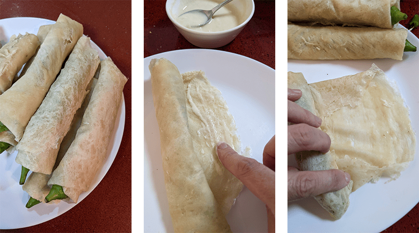 מקפלים פנימה את השוליים התחתונים ומגלגלים במהודק כמעט עד הסוף, מורחים מעט מהרביכה על הבצק וממשיכים לגלגל עד הסוף, מהדקים ומוודאים שהלומפיה סגורה היטב והקצה נדבק כמו שצריך. ממלאים ומגלגלים את את כל הפלפלים באותו האופן.