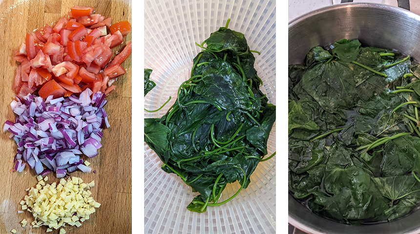 חותכים בצל סגול ועגבניה לקוביות בינוניות ואת הג'ינג'ר לקוביות קטנות. מוסיפים לקערה עם עלי הבטטה.