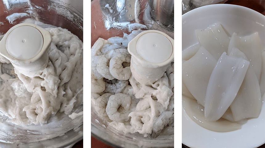 מכינים את המילוי – מניחים את הקלמרי בקערת מעבד מזון וטוחנים למשחה. מוסיפים את השרימפס ומעבדים קלות כך שעדיין ישנן חתיכות שרימפס מורגשות. מעבירים לקערה, מוסיפים מלח, סוכר, שמן שומשום, פלפל לבן, יין בישול סיני וקורנפלור ומערבבים לאיחוד.