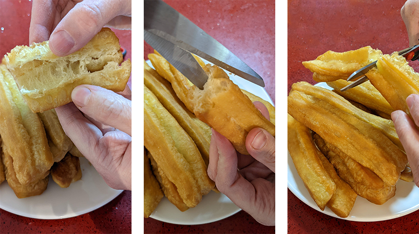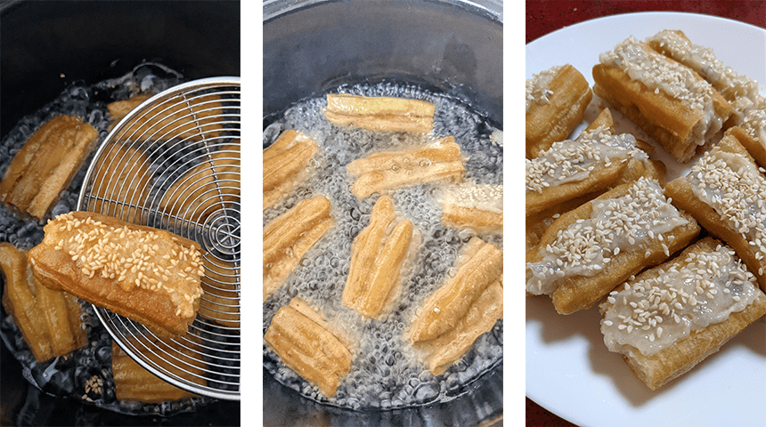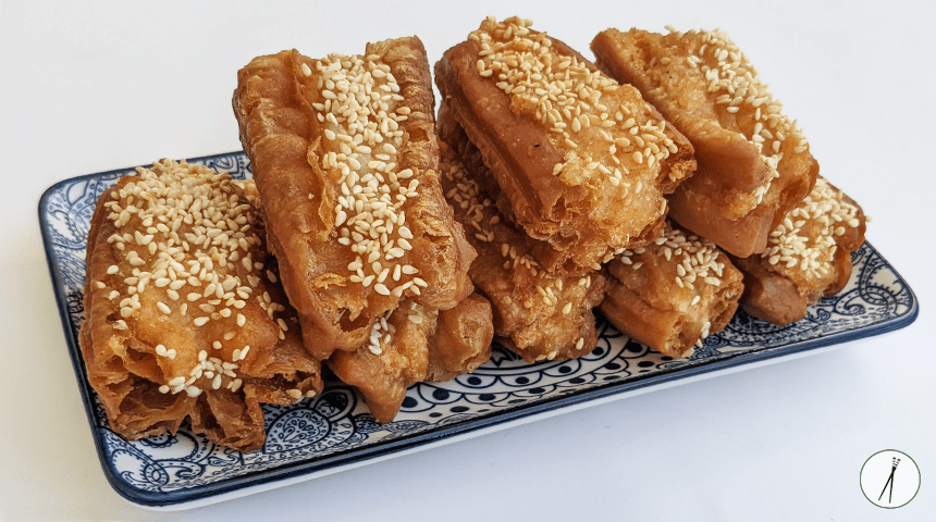 יו-טייאו ממולא – Zhá niàng yóutiáo. יו-טייאו הם מקלות בצק מטוגנים בשמן עמוק הנפוצים מאוד בסין וטייוואן (מתכון שלהם תוכלו למצוא פה). במתכון הזה ממלאים את מקלות הבצק בממרח פירות ים ומטגנים שנית. התוצאה היא חטיף מושחת וטעים להפליא, פריך מאוד מבחוץ ומעט צמיגי מבפנים הודות למרקם של פירות הים.