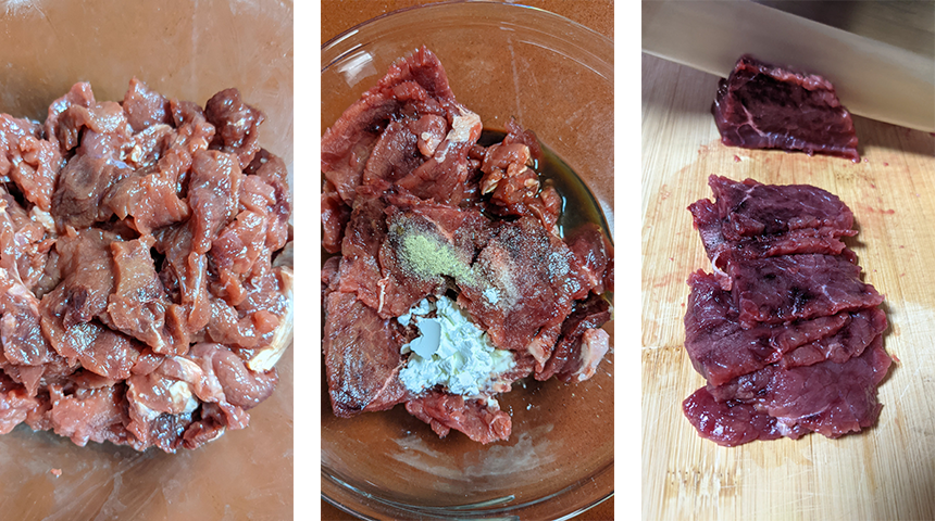 פורסים את הבשר לפרוסות דקיקות, הכי נוח לפרוס כשהבשר חצי קפוא. מניחים את הבשר בקערה ומוסיפים יין בישול סיני, פלפל לבן, מלח, רוטב סויה וקורנפלור. מערבבים היטב ומשרים לפחות 30 דקות.