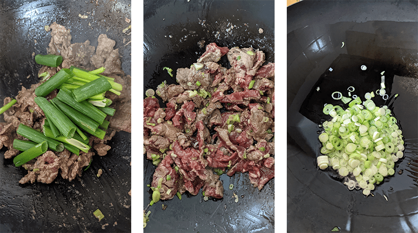 מחממים שתי כפות שמן בווק על אש גבוהה. מוסיפים את החלקים הלבנים של הבצל הירוק ומטגנים מעט. מוסיפים את הבשר ומטגנים תוך כדי ערבוב והפרדת הפרוסות עד להשחמה קלה, מוסיפים את החלקים הירוקים של הבצל הירוק ומטגנים חצי דקה נוספת, מכבים את האש ומוציאים את הבשר לצלחת.
