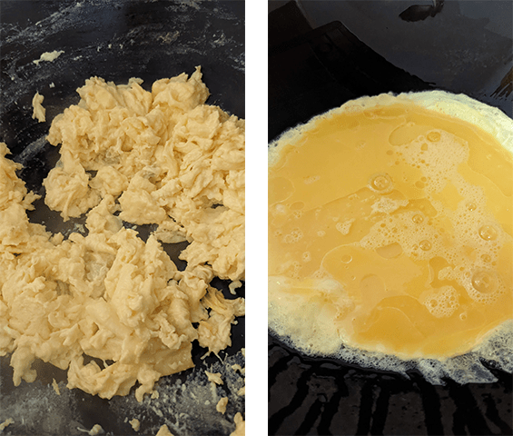 מחממים 2 כפות שמן בווק על אש גבוהה, מוסיפים ביצים ומטגנים עד שהביצים חצי מוכנות. מערבבים בעדינות ומחלקים את הביצים לחתיכות גדולות למעין מקושקשת גסה, כשהביצים עשויות לחלוטין אך עדיין בהירות מוציאים לצלחת.