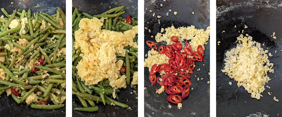 מוסיפים שתי כפות שמן לווק, מוסיפים שום וג'ינג'ר ומטגנים חצי דקה. מוסיפים פרוסות צ'ילי ומטגנים חצי דקה נוספת. מוסיפים את השעועית המבושלת, מחזירים את הביצים המטוגנות ומערבבים. מוסיפים רוטב סויה וחצי כפית מלח ומערבבים קלות.