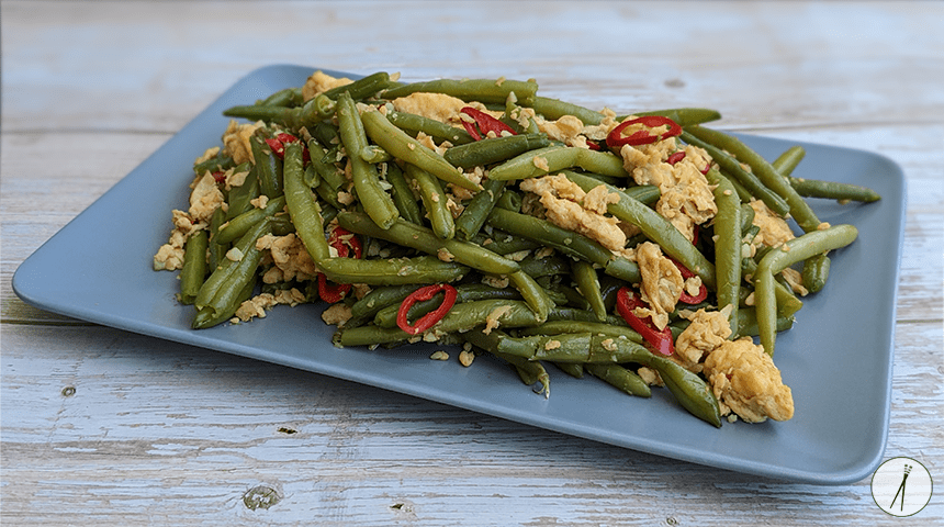 שעועית ירוקה מוקפצת עם ביצה – Sìjì dòu chǎo dàn. מנה סינית של שעועית ירוקה מוקפצת בזריזות עם ביצה, מתובלת בשום, ג'ינג'ר וצ'ילי והטעם שלה מאוד אופייני לסין. המנה מוגשת כחלק מהארוחה כמנת ירק בליווי אורז לבן. אם לא אוהבים חריף אפשר להחליף את הצ'ילי בפלפל אדום. בעונה אפשר (ואף רצוי) להחליף את השעועית הירוקה הקפואה בשעועית טרייה.