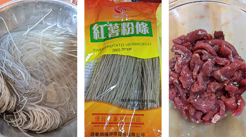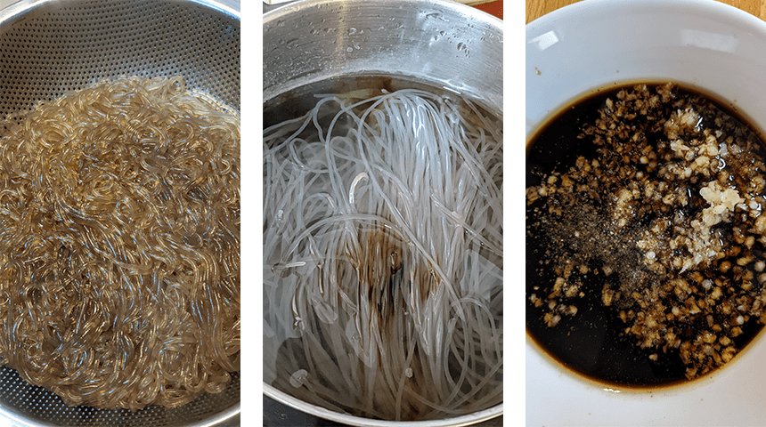 מכינים את האטריות – מסננים את האטריות ומניחים בסיר גדול, מוסיפים מים עד לגובה 2 ס"מ מעל האטריות. מוסיפים סויה כהה מתוקה (שתיתן גוון עמוק לאטריות השקופות) ומביאים לרתיחה. מערבבים מידי פעם על מנת שהאטריות לא ידבקו אחת לשנייה. מבשלים את האטריות כחצי דקה לאחר הרתיחה, האטריות צריכות להיות רכות ללא תחושת נגיסה (לא אל-דנטה). מסננים את האטריות, מוסיפים שמן שומשום ומערבבים היטב. משאירים את האטריות במסננת לייבוש.