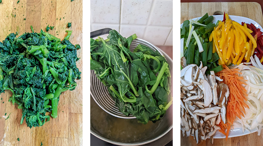 מכינים את הירקות – חותכים את הפלפלים לרצועות דקות. חותכים את הגזר לגפרורים ופורסים את הבצל לאורכו לרצועות לא דקות מידי (בעובי של 4-5 מ"מ). מסירים את הרגליים מהפטריות ופורסים לפרוסות. חותכים את הבצל הירוק למקטעים באורך 7-8 ס"מ. מרתיחים מים בסיר ומוסיפים את התרד, חולטים חצי דקה במים הרותחים ומוציאים לקערה עם מים קרים לצינון. סוחטים היטב את התרד וחותכים ל-2-3 חלקים.