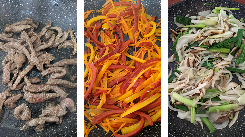 מטגנים את הירקות – במחבת רחבה על אש בינונית-גבוהה מחממים מעט שמן, מוסיפים בצל, בצל ירוק, פטריות ומעט מלח. מטגנים עד לריכוך ומוציאים לצלחת.