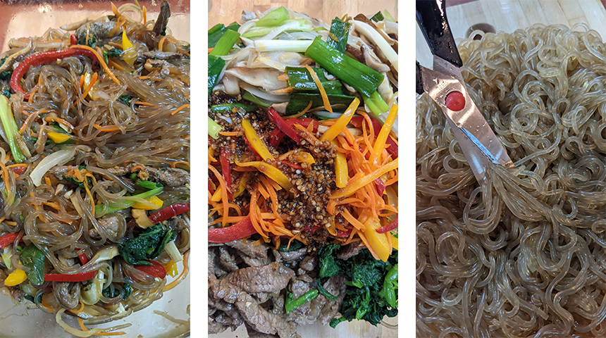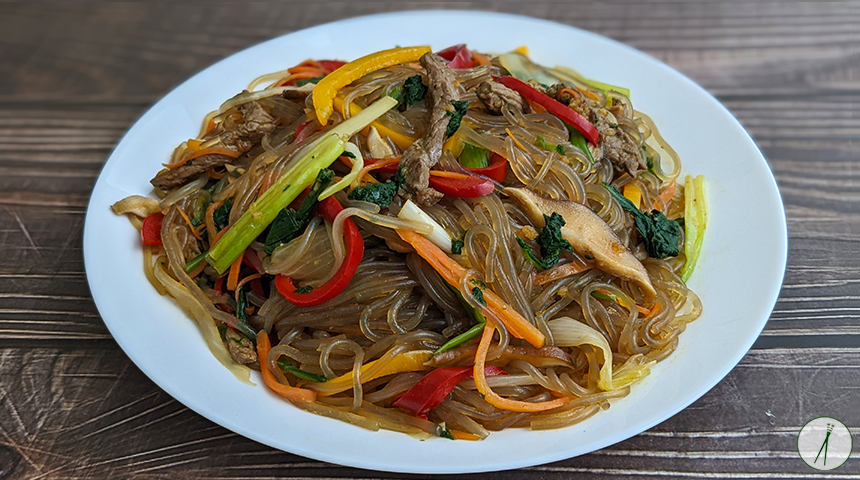 ג'אפצ'ה – Japchae. מנת אטריות בטטה (אטריות זכוכית) קוריאנית מסורתית שבמקור הוגשה בחגים ואירועים מיוחדים אך כיום הפכה לנפוצה. מנה צבעונית, עשירה בירקות ובעלת טעם מתקתק-מלוח. אפשר לגוון בסוג החלבון (פירות ים/חזיר) ובסוג הפטריות (שיטאקי מיובשות/מלך היער). לקבלת מנה טבעונית אפשר להחליף את הבשר בטופו או להשמיטו לחלוטין. הכנת המנה דורשת זמן מאחר ומטגנים את המרכיבים בנפרד כדי לשמור על צבע הירקות ועל טעמם, אך היא בהחלט שווה את זה.