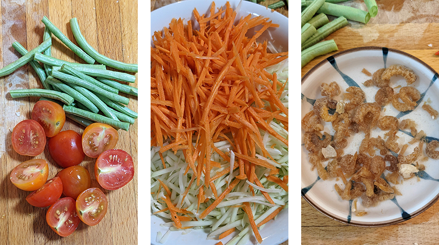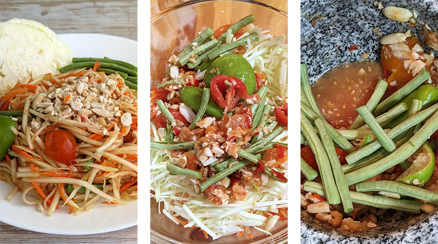 סום טאם – Som Tam. סלט תאילנדי רענן וחריף של פפאיה ירוקה. אחד המאכלים הכי מזוהים עם המטבח התאילנדי שם ניתן למצוא אותו במגוון וריאציות וברמות חריפות משתנות. את הסלט מכינים באופן מסורתי בתוך מכתש ועלי גדול ממדים, אני השתמשתי במכתש ועלי קטן שבו כתשתי את מרכיבי הטעם והעברתי אותם לקערה גדולה יותר שיכולה להכיל את הפפאיה. אם אין ברשותכם מכתש ועלי בכלל אפשר לקצוץ את המרכיבים ידנית אך הטעם לא יהיה מדויק.
