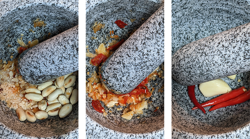 במכתש ועלי מניחים שום וצ'ילי וכותשים לתערובת גסה. מוסיפים רוטב דגים, סוכר דקלים ובוטנים.