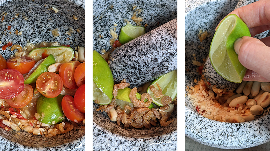 חותכים את הליים לפלחים גדולים, סוחטים את המיץ לתוך המכתש ומוסיפים את הקליפות. מסננים את השרימפס ממיי ההשרייה ומוסיפים למכתש. כותשים מעט את תכולת המכתש ומוסיפים עגבניות שרי. מועכים אותן קלות לשחרור המיצים ומערבבים בעזרת כף והעלי לסירוגין.