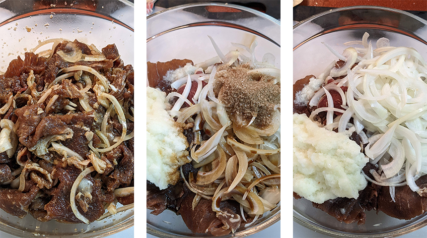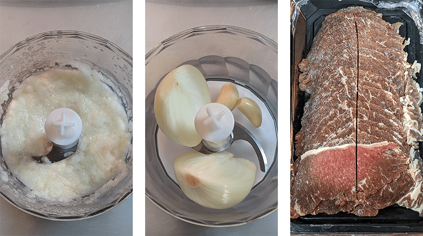 מכינים את הבשר – חוצים את פרוסות הבשר לשניים לקבלת חתיכות בגודל ביס ומעבירים לקערה. מקלפים את הבצל והשום. מניחים בצל אחד חצוי במעבד מזון יחד עם השום, מעבדים למשחה חלקה ומעבירים לקערה עם הבשר.