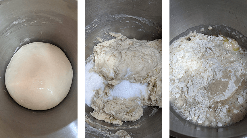 מכינים בצק – בקערת מיקסר מערבבים במהירות נמוכה קמח, שמרים, שמן זית ומים עד לקבלת בצק גס. מוסיפים מלח וסוכר, מגבירים את המהירות לבינונית ומערבלים 5 דקות. מגבירים למהירות גבוהה ומערבלים 5 דקות נוספות. מעבירים את הבצק לקערה משומנת במעט שמן זית, מכסים ומניחים להתפחה 30 דקות. מקפלים את הבצק פעם אחת מכל כיוון (בצורת מעטפה) יוצרים כדור ומתפיחים 20 דקות נוספות.