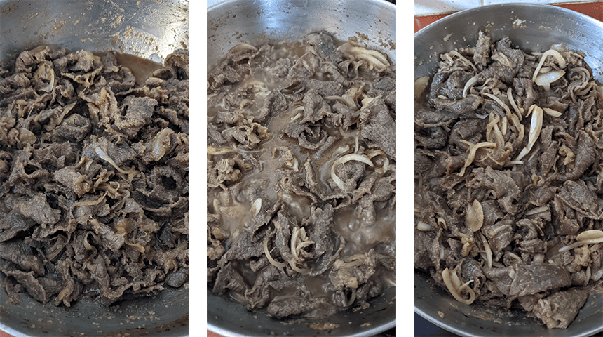מכינים את המילוי – מחממים מעט שמן במחבת עמוקה על אש גבוהה. מוסיפים את הבשר המושרה ומטגנים עד שרוב הנוזלים התאדו והבשר שחום. מסירים מהאש ומניחים לצינון קל.