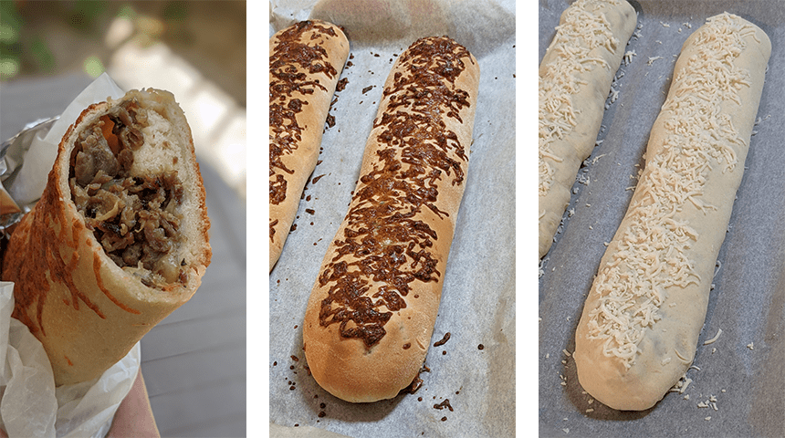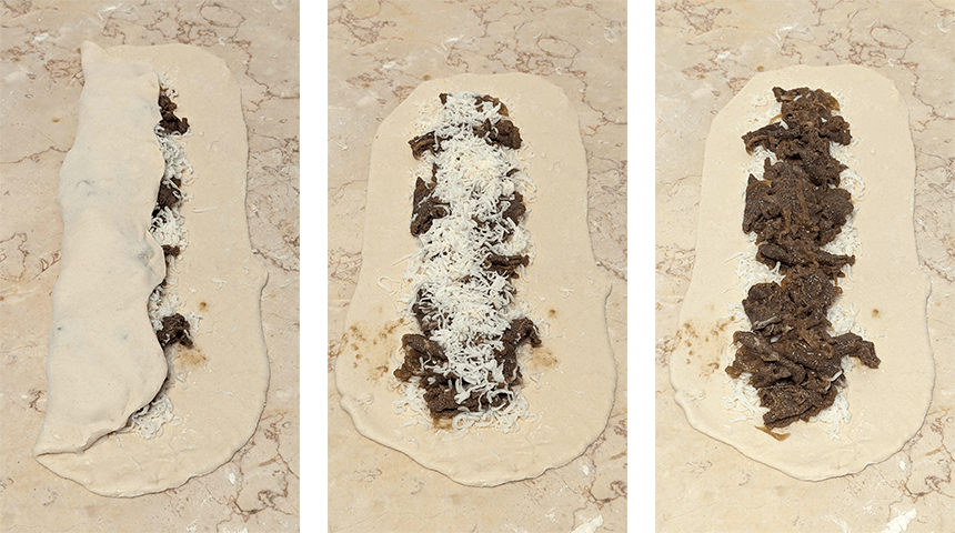 מניחים רבע מכמות הבשר על שכבת המוצרלה ומפזרים עוד קצת גבינה על הבשר. סוגרים את הבצק על הבשר והמוצרלה ליצירת גליל הדוק, צובטים את הקצוות לסגירה, מניחים בתבנית מרופדת בנייר אפייה כשקו התפר כלפי מטה ומפזרים קצת מוצרלה על הגליל. יוצרים גלילים נוספים עם שאר כדורי הבצק והמילוי.