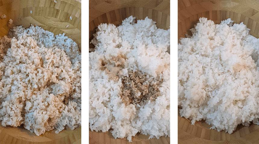 מעבירים את האורז לקערה. מוסיפים רוטב סויה, מירין ואבקת דאשי, מערבבים היטב לפיזור אחיד ומניחים לצינון קל.