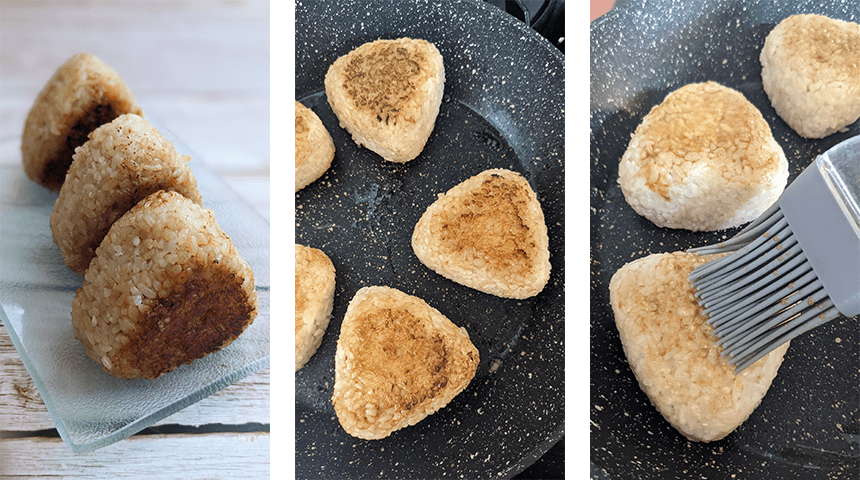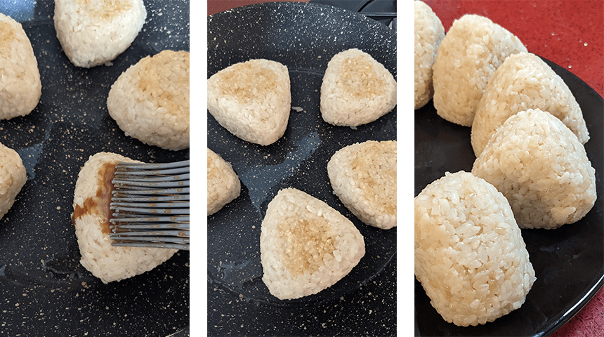 מחממים כף שמן שומשום במחבת על אש בינונית – נמוכה. מניחים את משולשי האורז במחבת וצורבים משני הצדדים עד להזהבה קלה. מורחים מעט מתערובת המיסו על שני צידי המשולשים (יש לשים לב לא למרוח יותר מדי מהתערובת על מנת שהמשולשים לא יתפרקו).