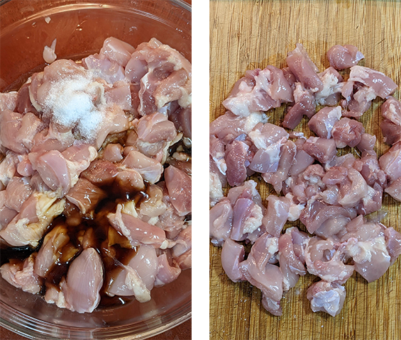 מכינים את העוף – חותכים את הפרגיות לקוביות בגודל 2×2 ס"מ ומניחים בקערה. מוסיפים מלח, יין בישול סיני, רוטב סויה ורוטב צדפות ומערבבים היטב. מכסים ומניחים ל-10 דקות.