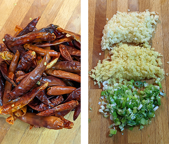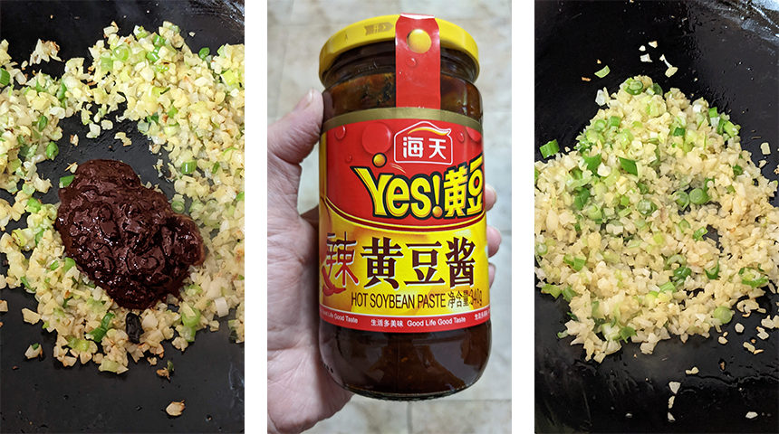 מכינים את המנה – מחממים שלוש כפות שמן בווק על אש גבוהה. מוסיפים שום, ג'ינג'ר וחלקים לבנים של בצל ירוק. מטגנים חצי דקה, מוסיפים דו-באן-ג'יאנג ומערבבים.