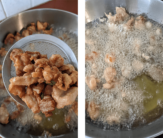 מטגנים את העוף – לקערת העוף המושרה מוסיפים קורנפלור ומערבבים לציפוי אחיד, מוסיפים שמן ומערבבים. במחבת רחבה או בווק מחממים שמן לטיגון עמוק לחום בינוני (150 מעלות), מוסיפים את קוביות העוף אחת אחת על מנת שלא ידבקו ומטגנים עד שהן משחימות קלות. מוציאים למסננת, מחממים את השמן לחום גבוה (220 מעלות) מחזירים את העוף ומטגנים עד ששחום וקריספי. מוציאים למסננת ומניחים בצד.