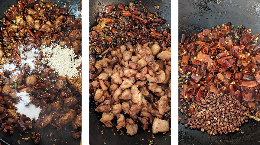 עוף חריף סיצ'ואני – Làzǐ jī.  מנה של קוביות עוף מטוגנות ופריכות מוקפצות בתערובת תבלינים ארומטית ומאוד חריפה. פרופיל הטעמים במנה הוא מה-לה, כלומר חריף-מאלחש ומאוד אופייני לחבל סיצ'ואן שבסין. אפשר למתן מעט את החריפות ע"י הפחתה מכמות פלפל השאטה שבמתכון. מומלץ להצטייד בטישו ולפתוח חלונות לפני ההקפצה של התבלינים.