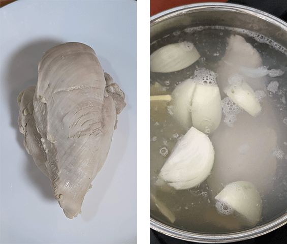 מבשלים את העוף – פורסים את הג'ינג'ר לפרוסות, חותכים את הבצל לרבעים ומניחים בסיר. מוסיפים כ-2 ליטר מים ומביאים לרתיחה. מוסיפים את חזה העוף ומבשלים 25 דקות ברתיחה קלה. מוציאים את העוף לצלחת ומצננים.