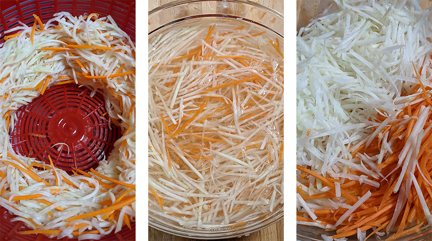 מכינים את הירקות – חותכים את הקולורבי ואת הגזר לגפרורים (אפשר גם בעזרת מנדולינה או קולפן ייעודי) ומניחים בקערה גדולה. מוסיפים 2 כפיות מלח וממלאים את הקערה במים. מערבבים, משרים 5 דקות ומסננים. סוחטים היטב את עודפי המים מהירקות (אפשר להשתמש במייבש חסה) ומעבירים לקערה נקייה.