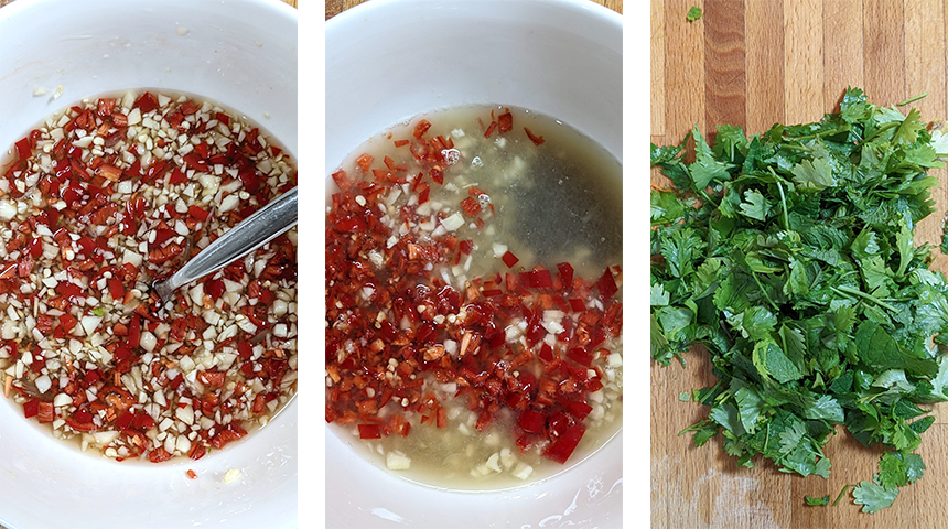 מכינים את הרוטב – קוצצים דק שום, צ'ילי וסוכר דקלים. מעבירים לקערית, מוסיפים מיץ ליים ורוטב דגים ומערבבים היטב עד להמסת הסוכר.