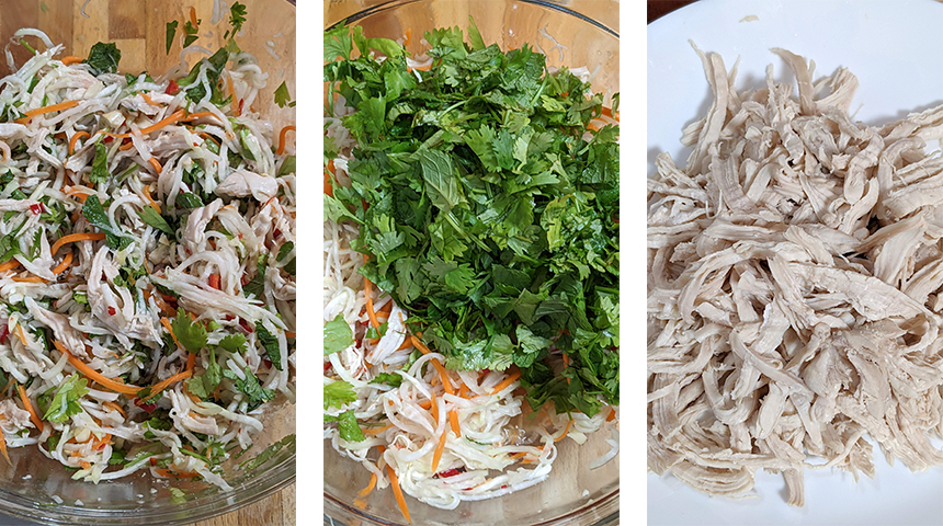 מרכיבים את הסלט – מפרקים בידיים את העוף לרצועות דקות ומעבירים לקערה עם הקולורבי והגזר. מוסיפים את הרוטב ואת עשבי התיבול ומערבבים לפיזור אחיד.