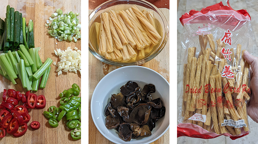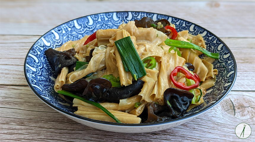 יובה מוקפצת – Chǎo fǔzhú. מנה סינית של יובה מוקפצת עם פטריות שחורות, סלרי וצ'ילי. יובה היא הקרום שנוצר על פני חלב הסויה בעת חימומו, את הקרום הזה מרימים בזהירות מעל פני החלב ומניחים לייבוש. טעמה של היובה עדין ומזכיר טופו אך מרקמה שונה. על מנת להשתמש ביובה יש צורך להשרות אותה במים לפני הבישול וכך ניתן להשתמש בה במגוון דרכים. אם רוצים להפוך את המנה לטבעונית מחליפים את רוטב הצדפות ברוטב פטריות למוקפצים ואת אבקת מרק העוף לאבקת מרק עוף פרווה או שאפשר לוותר.