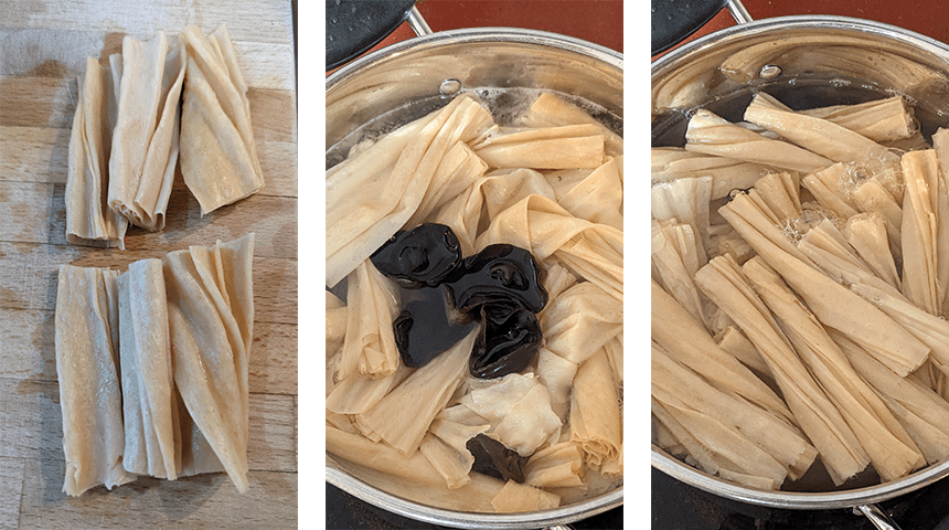 מניחים מקלות יובה בקערה מלאה במים קרים, מניחים את הפטריות השחורות בקערת מים נפרדת ומשרים במשך כשעתיים.