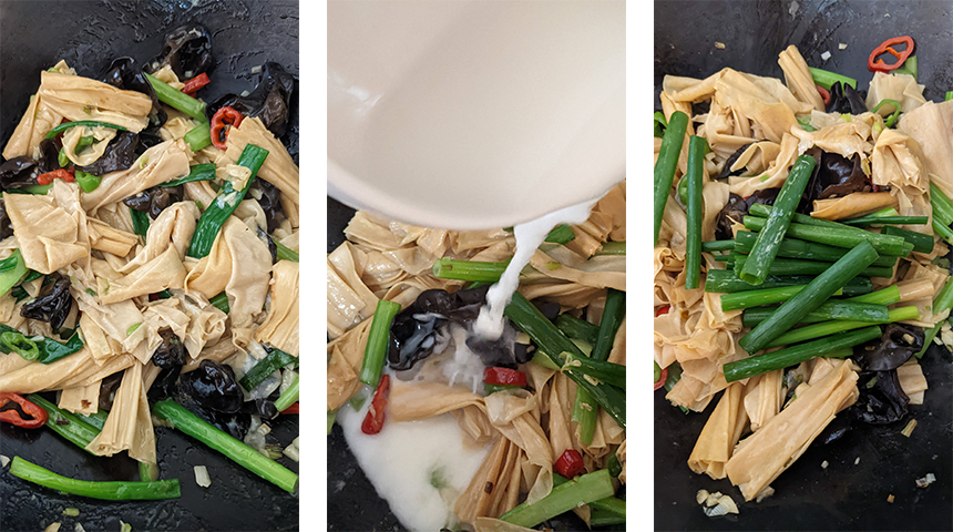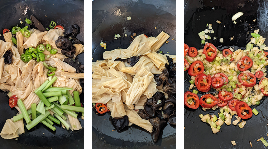 מוסיפים יובה ופטריות ומטגנים יחד כדקה. מוסיפים צ'ילי ירוק וסלרי ומערבבים דקה נוספת עד שהסלרי מתרכך מעט. מוסיפים את החלקים הירוקים של הבצל הירוק ומערבים מעט.