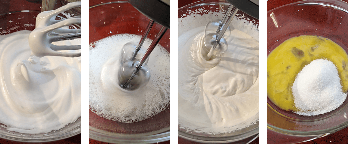 בקערה נפרדת מקציפים את החלבונים, כשמתחיל להיווצר קצף מוסיפים את שארית הסוכר (45 גר') בהדרגה תוך כדי הקצפה עד שמקבלים קצף יציב ומבריק.