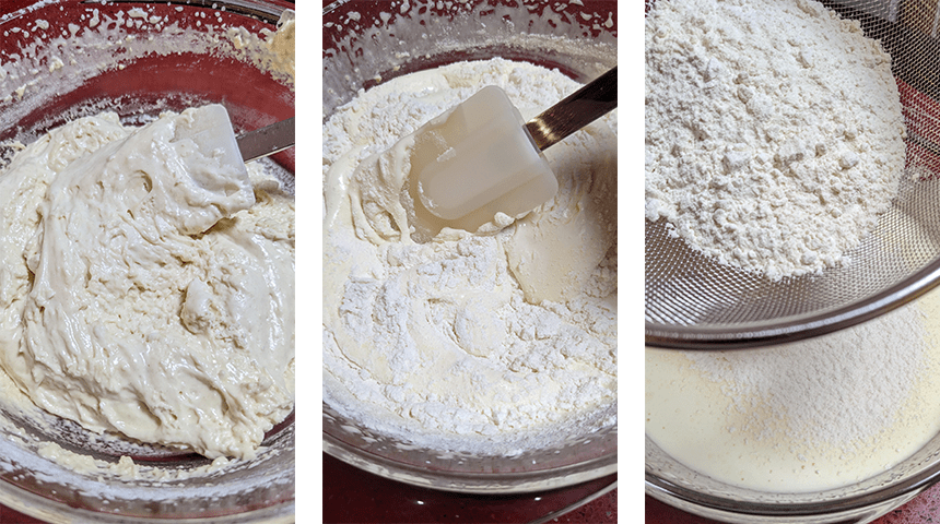 מנפים קמח לקערה על החלמונים המוקצפים (הקערה הראשונה) ובעזרת מרית מקפלים את הקמח אל החלמונים בעדינות.