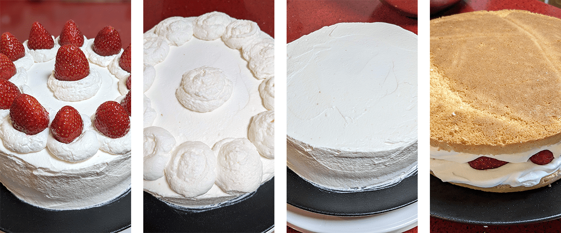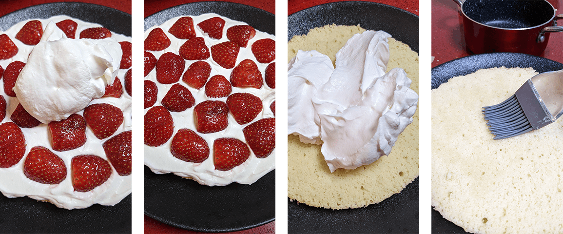 מורחים שכבה עבה של קצפת על החצי התחתון של העוגה, מסדרים חצאי תותים על הקצפת ומורחים שכבת קצפת נוספת על התותים.
