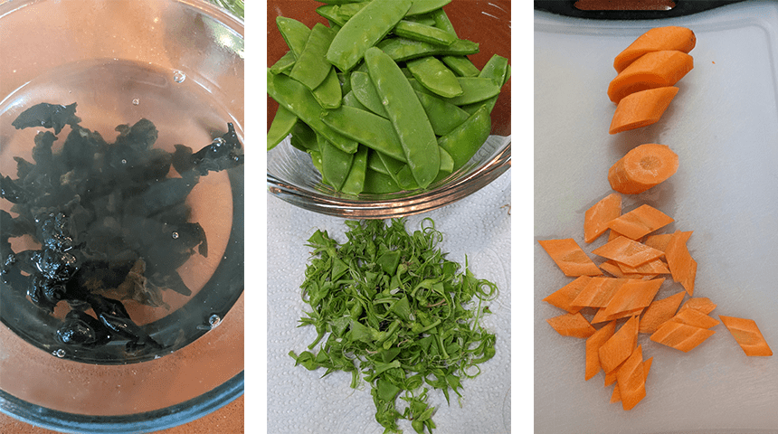 מכינים את הירקות – משרים פטריות שחורות במים חמים 15-20 דקות, מסננים ומסירים את החלקים הקשים. קוצצים דק שום וג'ינג'ר. חותכים את הגזר לפרוסות אלכסוניות עבות, מעמידים כל פרוסה על הצד החתוך ופורסים לפרוסות דקיקות בצורת מעויין. שוטפים היטב אפונת שלג מסירים את הקצוות ואת הסיבים המחוברים לצידי התרמיל.