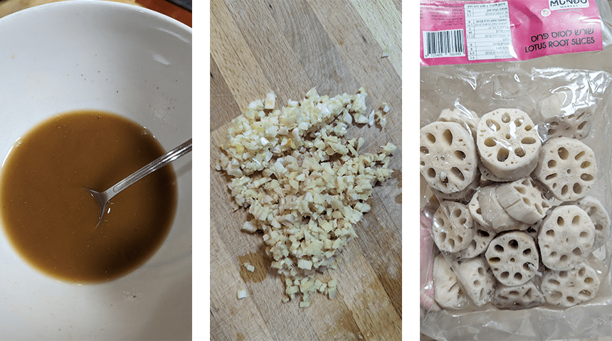 בקערית מערבבים את מרכיבי הרוטב חוץ משמן השומשום ומניחים בצד.