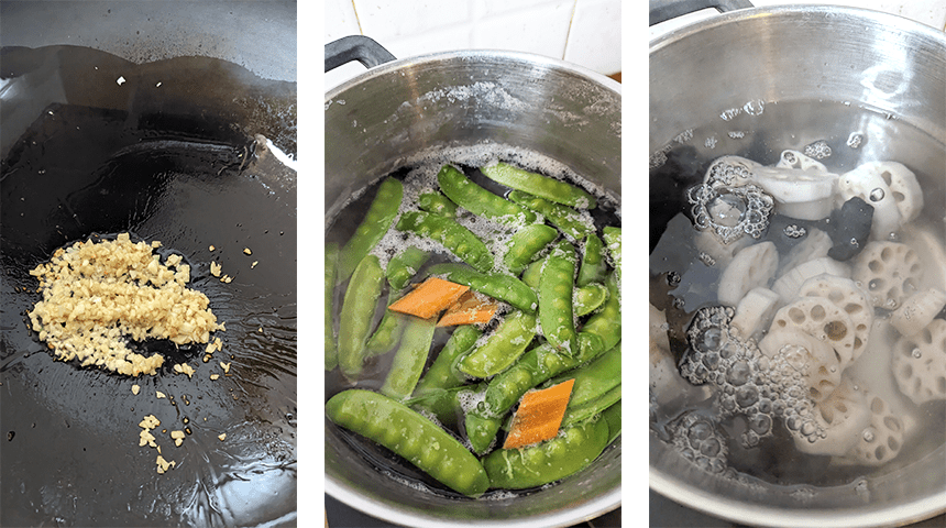 מרתיחים 3 ליטר מים בסיר. מוסיפים פרוסות שורש לוטוס ופטריות שחורות, מביאים לרתיחה חוזרת ומוציאים למסננת (משאירים את המים בסיר). אם משתמשים בשורש לוטוס קפוא כדאי לשטוף את פרוסות הלוטוס לאחר החליטה ולשפשף אותן היטב בין האצבעות על מנת להיפטר מהסיבים הדקים הנמצאים על גבי הפרוסות. מכניסים לסיר עם המים הרותחים אפונת שלג וגזר ומביאים שוב לרתיחה. מוציאים ומעבירים למסננת עם הלוטוס והפטריות.