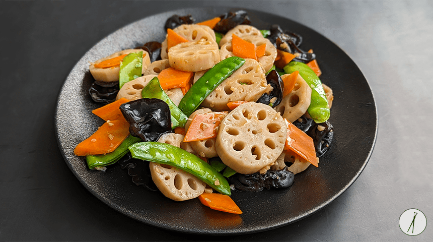 מוקפץ "בריכת לוטוס" – Hétáng xiǎochǎo. מנה סינית קנטונזית מסורתית המגיעה מאזור גואנג-דונג בדרום מזרח סין. מנה צבעונית ויפיפיה של שורש לוטוס מוקפץ עם אפונת שלג, פטריות שחורות וגזר, עם רוטב עדין שלא משתלט על טעמם של הירקות. באופן מסורתי המנה מוגשת על עלה גדול של לוטוס מה שמעניק משמעות נוספת לשמה – "בריכת לוטוס".