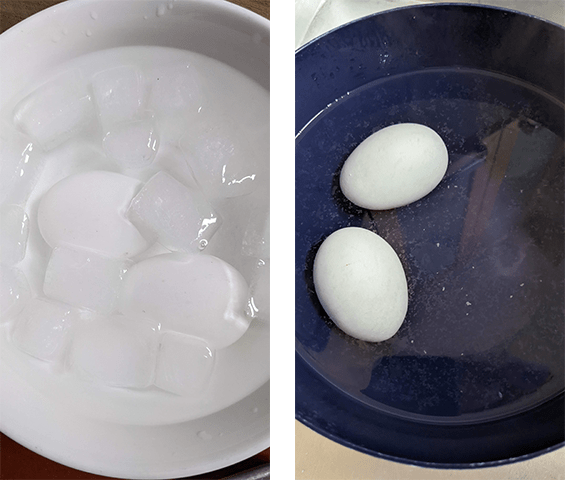 מכינים ביצי אונסן – מרתיחים מים בסיר קטן. כשהמים רותחים מכבים את האש, מכניסים בזהירות ביצים קרות מהמקרר, סוגרים את המכסה וממתינים 13 דקות. מוציאים את הביצים ומעבירים לכלי עם מי קרח למספר דקות עד שהביצים מתקררות.
