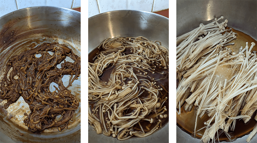 במחבת עמוקה על אש גבוהה שמים את הפטריות ומוסיפים רוטב סויה, סאקה, מירין וסוכר. מערבבים ומביאים לרתיחה. מנמיכים את הלהבה לבינונית ומבשלים עד שהנוזלים מתאדים כמעט לחלוטין ונוצר רוטב סמיך שעוטף את הפטריות.