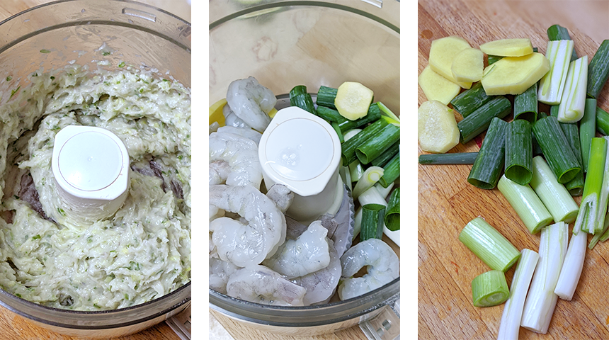 חותכים גס בצל ירוק וג'ינג'ר. מכניסים לקערת מעבד מזון יחד עם שרימפס וחלבון ביצה. טוחנים מעט ומוסיפים מלח, סוכר, פלפל לבן, קורנפלור ושמן שומשום. טוחנים יחד עד לקבלת משחה חלקה ואחידה.