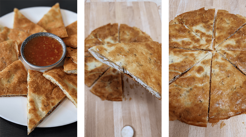חותכים כל עיגול ל-8 משולשים שווים בגודלם, מסדרים בצלחת ומגישים בליווי רוטב צ'ילי מתוק.