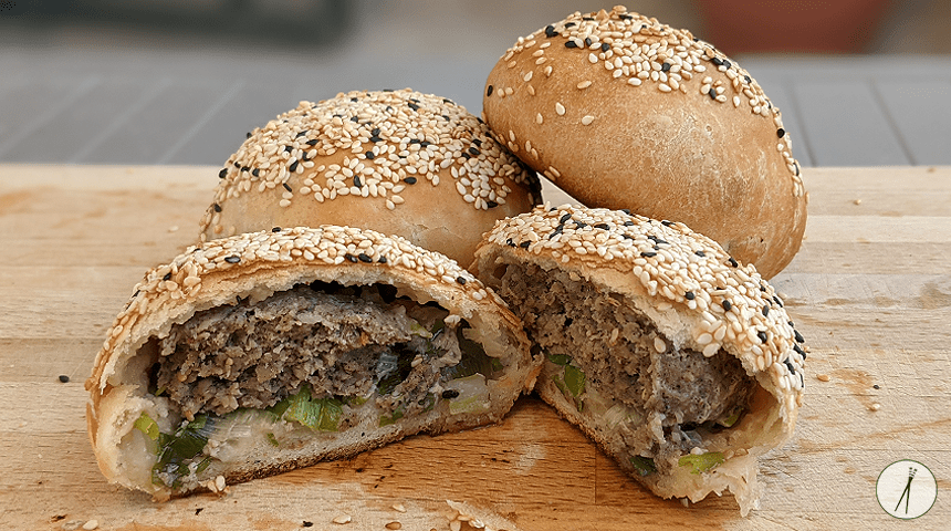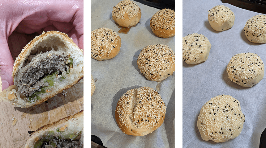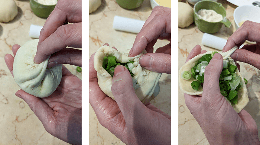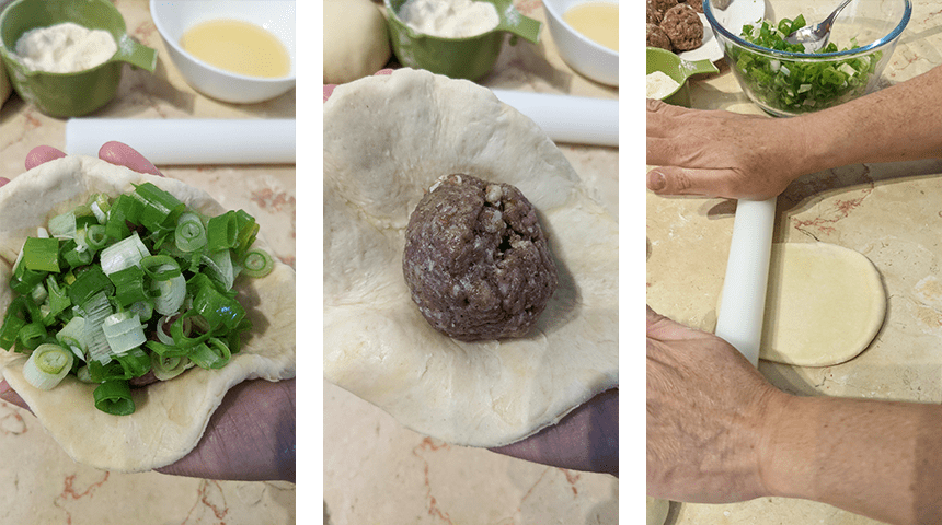 יוצרים את הלחמניות – לוקחים כדור בצק, מרדדים לעיגול בקוטר כ-10 ס"מ. מניחים כדור בשר במרכז העיגול יחד עם 2 כפות בצל ירוק קצוץ. סוגרים את הבצק סביב המילוי, אוטמים היטב ומניחים על משטח מקומח כשצד התפר כלפי מטה. ממלאים באותו האופן את שאר הכדורים.
