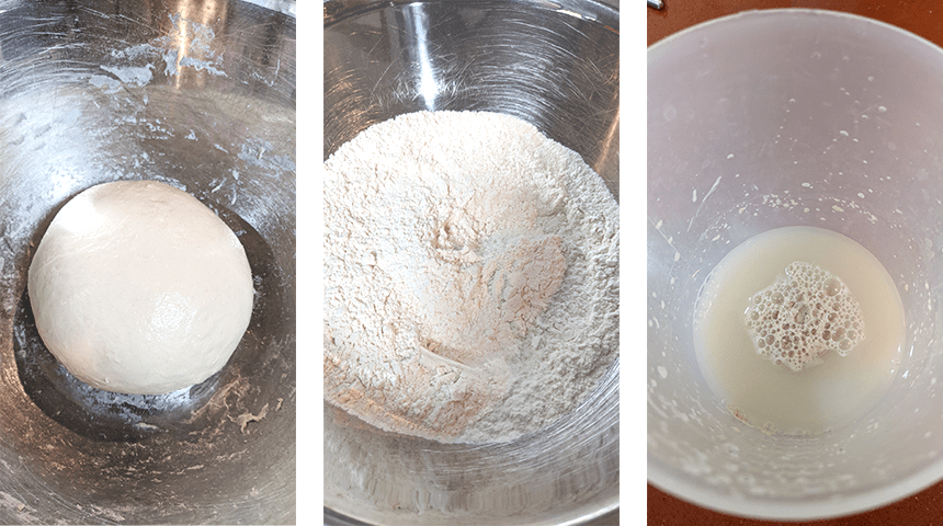 מכינים את הבצק – בכוס או קערית מערבבים מים חמימים ושמרים ומניחים לחמש דקות עד שהשמרים מבעבעים.